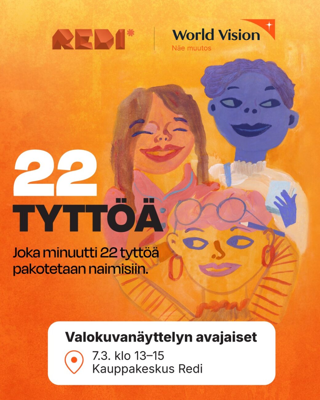 Kauppakeskus Redi, Suomen World Vision ja vaikuttaja Hanna Angelvuo avaavat naistenpäivän kunniaksi pysäyttävän 22 tyttöä -valokuvanäyttelyn lauantaina 7.3. klo 13–15.